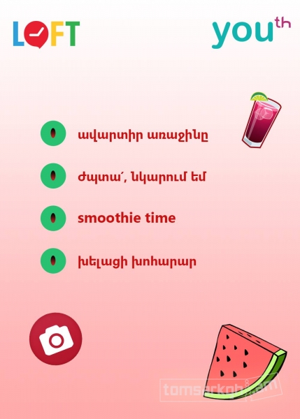 YOUth երիտասարդական կազմակերպությունը և LOFT ինքնազարգացման կենտրոնն ուրախությամբ հրավիրում են Ձեզ մասնակցելու ամենաուրախ, ամենահամով ու ամենակարմիր միջոցառմանը, որը տեղի կունենա հուլիսի 18-ին Loft-ի ներքին բակում(Մոսկովյան 3)։