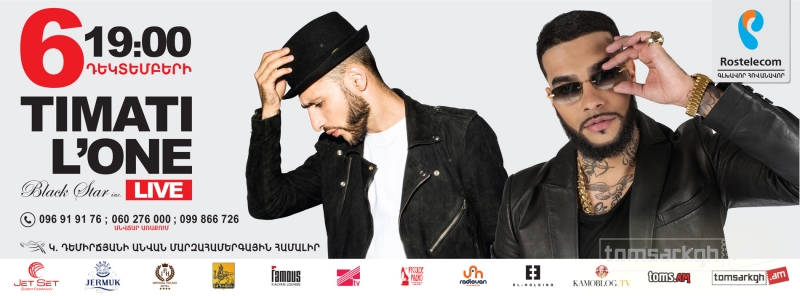 Առաջին անգամ Հայաստանում Կ. Դեմիրճյանի անվան մարզահամերգային համալիրի մեծ դահլիճում ելույթ կունենան ռուսական հիփ- հոփի հայտնի կատարողներ Timati-ն, L'One-ը` “Black Star inc.” խմբով: