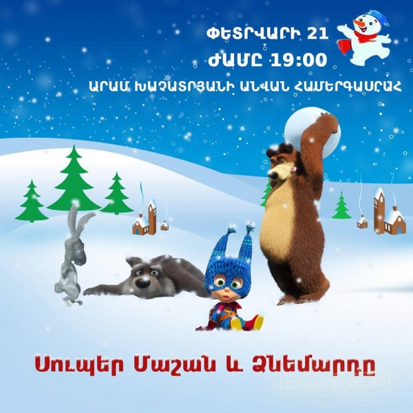 Առաջին անգամ Հայաստանում լազերային և լուսային ամանորյա մանկական շոու ներկայացում Սուպեր Մաշան և Ձնեմարդը` Ձմեռ պապիկի,Ձյունանուշիկի և այլ սիրված մուլտհերոսների մասնակցությամբ: Յուրաքանյուր տոմսի հետ երեխաներին սպասվում է անակնկալ ներկայացման օրը: