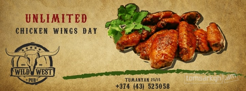 Wild west pub-ը, համաձայն արդեն ավանդական դարձած սովորույթի, չորեքշաբթի օրը հրավիրում է համտեսելու աննկարագրելի համեղ թևիկները ԱՆՍԱՀՄԱՆԱՓԱԿ քանակությամբ ու էլ ավելի բարձրացնելու տրամադրությունը որակյալ երաժշտության ու ջերմ մթնոլորտի շնորհիվ: