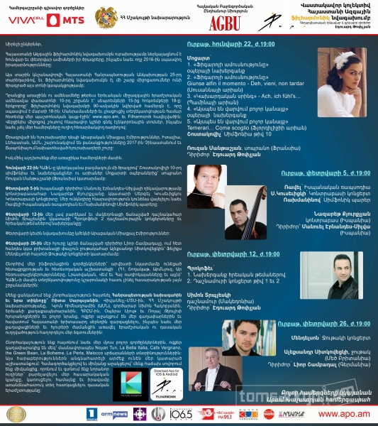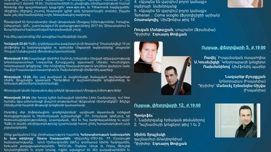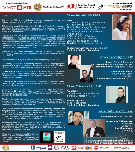 Հունվարի 22-ին ՀԱՖՆ-ը կներկայանա բազմագույն մի ծրագրով՝ Շոստակովիչի 10-րդ սիմֆոնիա և նախերգանքներ ու արիաներ Մոցարտի օպերաներից՝ սոպրանո Ռուզան Մանթաշյանի (Ֆրանսիա) կատարմամբ: