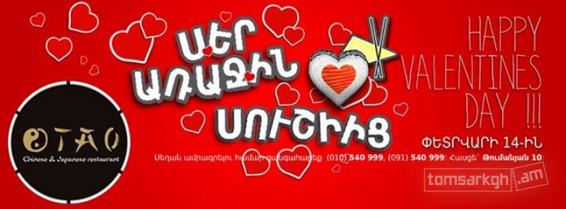 ՏԱՕ չինական և ճապոնական ռեստորանը սիրով հրավիրում է բոլորին միասին նշելու սիրահարների տոնը: Սուրբ Վալենտինի տոնի առթիվ Փետրվարի 14-ին Տաօ ռեստորանը պատրաստել է անակնկալ իր բոլոր այցելուներին: Սեղան ամրագրելու համար զանգահարեք: