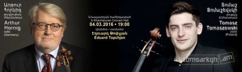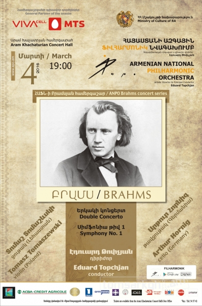 Մարտի 4-ին՝ ժամը 19-ին կհնչի Բրամսի թիվ 1 սիմֆոնիան և Կրկնակի կոնցերտը՝ լեհ ջութակահար Տոմաշ Տոմաշևսկու և գերմանացի թավջութակահար Արթուր Հորնիգի կատարմամբ: