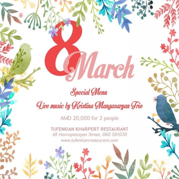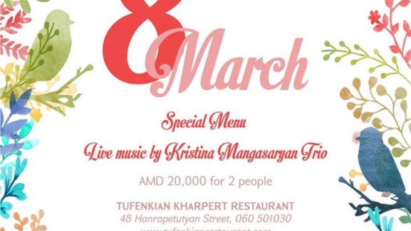 Celebrate Spring and International Women's Day on March 8 at Tufenkian Kharpert restaurant. Come and enjoy a beautiful evening with LIVE performance by Kristina Mangasaryan Trio, as well as taste our special menu for the day.