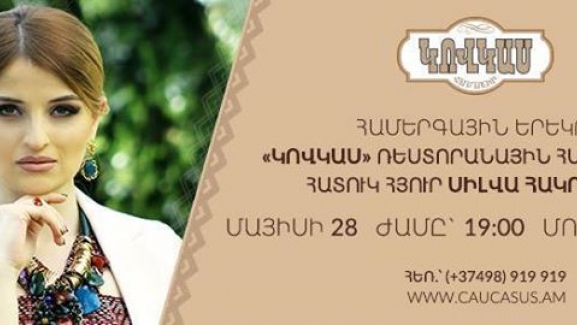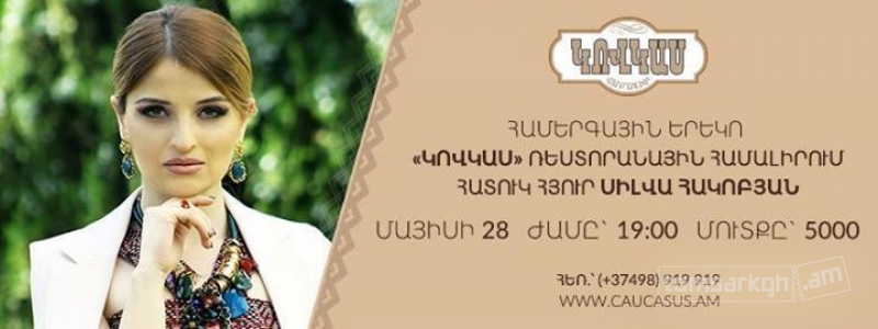 Մայիսի 28-ին «Կովկաս» ռեստորանային համալիրում տեղի կունենա արդեն ավանդույթ դարձած համերգային երեկո, որի հատուկ հյուրն է լինելու Սիլվա Հակոբյանը, ով կկատարի իր հին ու նոր սիրված երգերը: Համերգային ծրագիրը, որին կմասնակցի նաև «Կովկաս» պարային համույթը, անմոռանալի կդարձնի ձեր երեկոն: Սկիզբը ժամը 19:00-ին: Տեղերը խիստ սահմանափակ են: