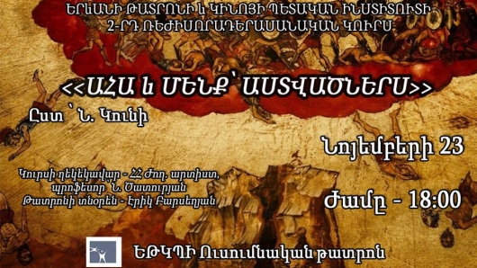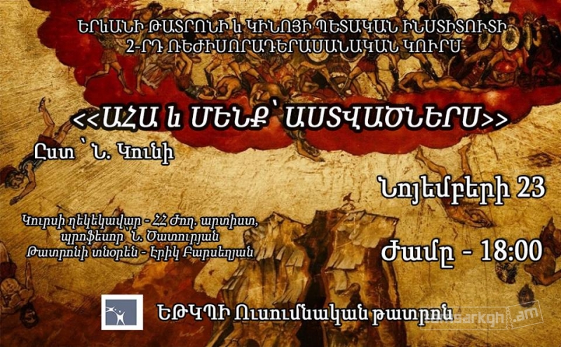 Ըստ՝ Ն. Կունի «Ահա և մենք՝ Աստվածներս». ներկայացումը ներկայացնում են Երևանի թատրոնի և կինոյի պետական ինստիտուտի 2-րդ ռեժիսորադերասանական կուրսը
