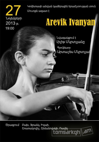 Նոյեմբերի 27-ին՝ ժամը 19:00-ին Կոմիտասի անվան երաժշտության տանը տեղի կունենա պրոֆեսոր Արտաշես Մկրտչյանի սան Արևիկ Իվանյանի մենահամերգը: