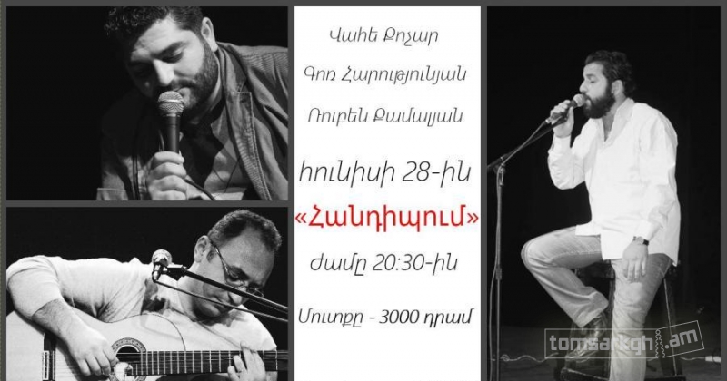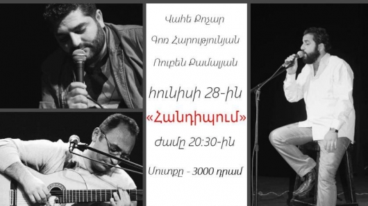 Հունիսի 28-ին` ժամը 20:30-ին հրավիրում ենք ձեզ ներկա գտնվել հեղինակային երգ- պոեզիա հերթական «Հանդիպման»-ը՝ բանաստեղծ Գոռ Հարությունյանի, հեղինակ կատարողներ Վահե Քոչարի և Ռուբեն Քամալյանի մասնակցությամբ: