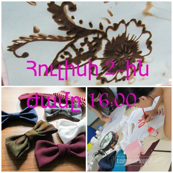 Բոլոր նրանք, ովքեր ցանկանում են ձեռքերին ունենալ հետաքրքիր նախշեր, յուրահատուկ մայկաներ և бабочка-ներ, այս շաբաթ ժամը 16:00-ին համեցեք մեզ մոտ և հատուկ հրավիրված մասնագետը կօգնի ձեր ամենաօրիգինալ պատկերացումները կյանքի կոչել:
