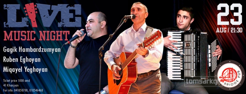 Սիրով հրավիրում ենք բոլոր ընկերներին և հյուրերին մասնակից լինելու Կենդանի Երաժշտության երեկոյի, որի հյուրերն են լինելու սիրված երգիչներ Գագիկ Համբարձումյանը, Ռուբեն Եղոյանը և Միքայել Եղոյանը իրենց յուրօրինակ կատարումներով՝ երևանյան երգեր, շանսոն, ռուսական երգեր, հեղինակային կատարումներ։