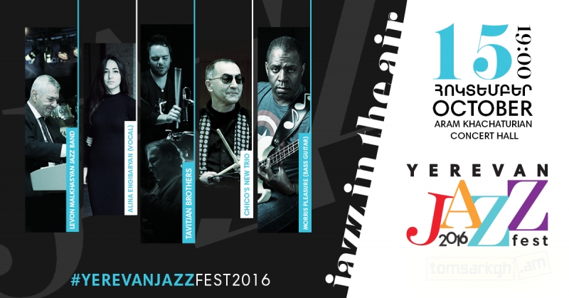 Արամ Խաչատրյանի համերգասրահում հոկտեմբերի 15-ին, ժամը 19:00-ին Yerevan Jazz Fest 2016-ի շրջանակներում ելույթ կունենան՝ Լևոն Մալխասյանը, Ալինա Ենգիբարյանը, Արմեն Թութունջյանը, Թավիթջան եղբայրները և Մո Փլեժրը: