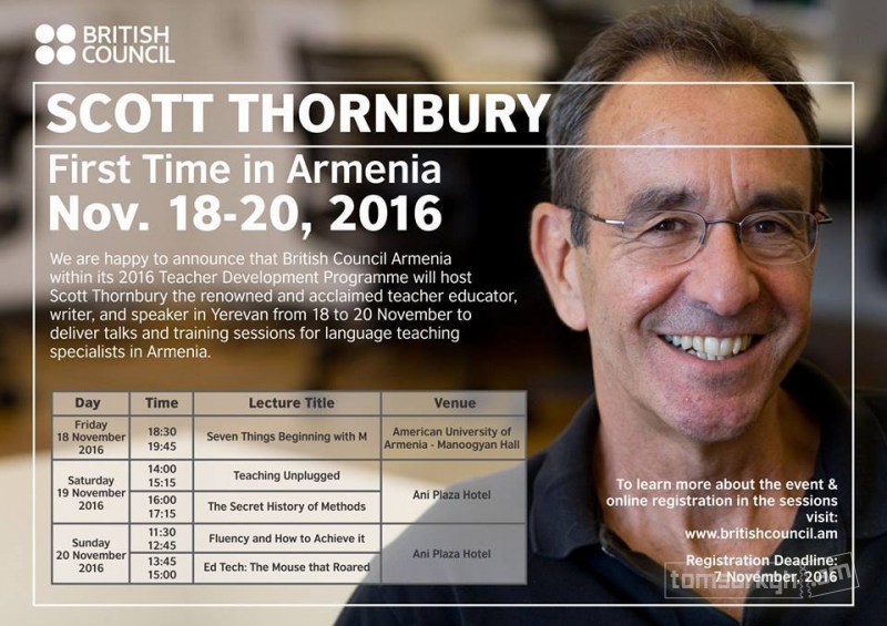 We are happy to announce that British Council Armenia within its 2016 Teacher Development Programme will host Scott Thornbury the renowned and acclaimed teacher educator, writer, and speaker in Yerevan from 18 to 20 November to deliver talks and training sessions for Language Teaching specialists in Armenia.