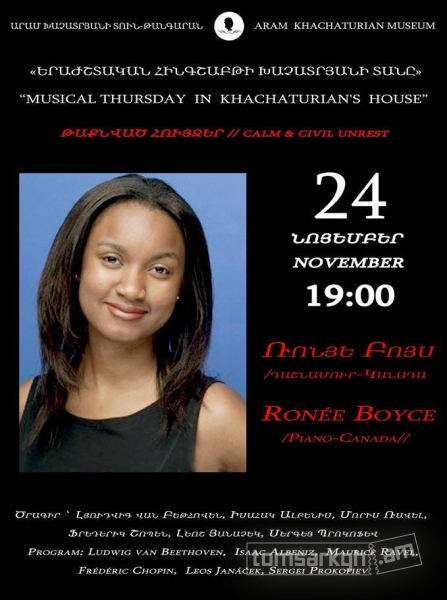 Նոյեմբերի 24-ին՝ ժամը 19:00-ին սիրով հրավիրում ենք Արամ Խաչատրյանի տուն-թանգարան վայելելու «Թաքնված հույզեր» խորագրով «Երաժշտական հինգշաբթի Խաչատրյանի տանը» շարքի հերթական համերգը: Երեկոյի ընթացքում ելույթ կունենա Կանադացի դաշնակահար Ռոնյե Բոյսը: Ծրագրում ընդգրկված են Լյուդվիգ վան Բեթհովենի, Իսահակ Ալբենիսի, Մորիս Ռավելի, Ֆրեդերիկ Շոպենի, Լեոշ Յանաչեկի և Սերգեյ Պրոկոֆևի ստեղծագործությունները: