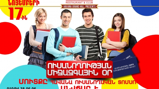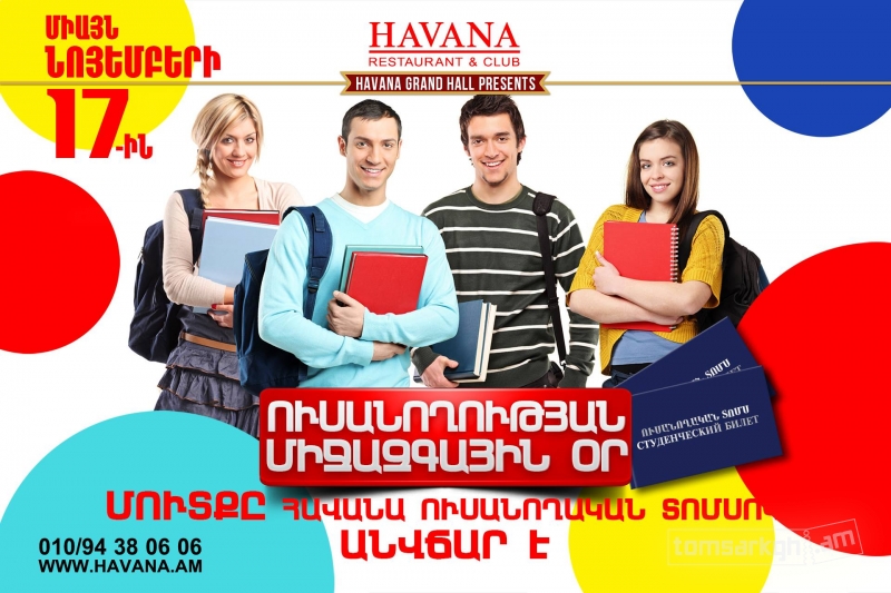 Նոյեմբերի 17-ն Ուսանողության միջազգային օրն է, և Հավանա Ռեստորանային Համալիրը՝ շնորհավորելով բոլոր ուսանողներին, միայն այդ օրը մուտքը Հավանա ուսանողական տոմսերով հայտարարում է անվճար։ Սիրելի ուսանողներ, շտապե՛ք դարձնել Ձեր տոնն անմոռանալի Հավանայի հետ։