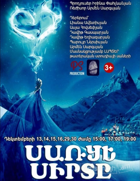 Դեկտեմբերի 13,14,15,16, 29,30-ին` ժամը 15:00,17:00,19:00-ին Ուսումնական (Համազգային) թատրոնի բեմում տեղի կունենա «Սառցե սիրտը» ներկայացումը: