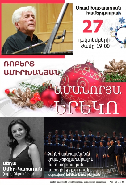 Ամանորին ընդառաջ՝ դեկտեմբերի 27-ին՝ ժամը 19-ին, Արամ Խաչատրյան համերգասրահում կկայանա կոմպոզիտոր Ռոբերտ Ամիրխանյանի հեղինակային երեկոն՝ “Տարեմուտի երգեր” խորագրով: Համերգին կմասնակցեն Ձայնի պահպանման վոկալ-երգչախմբային մասնագիտական դպրոցի երգչախումբը և մեներգչուհի Սեդա Ամիր-Կարայանը: Ողջ երեկոյի ընթացքում բեմում կլինի մաեստրո Ռոբերտ Ամիրխանյանը:
