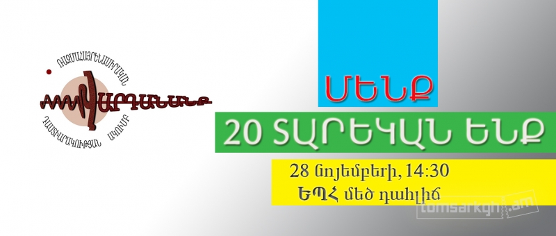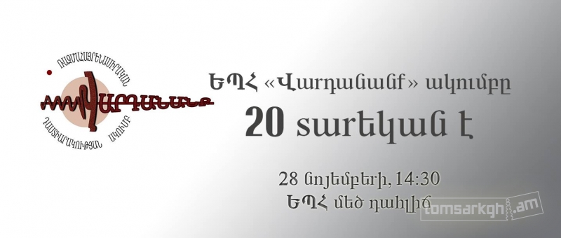 Հարգելի՛ հայրենակիցներ, սիրով հրավիրում ենք ձեզ՝ միասին տոնելու ԵՊՀ «Վարդանանք» ռազմահայրենասիրական դաստիարակության ակումբի հիմնադրման 20-ամյակը: Հանդիսավոր արարողությունը տեղի կունենա ս. թ. նոյեմբերի 28-ին՝ Ժամը 14:30-ին, ԵՊՀ մեծ դահլիճում: Միջոցառմանը ներկա են լինելու նաև ԵՊՀ ռեկտոր Արամ Սիմոնյանը, ՀՀ պաշտպանության նախարար Վիգեն Սարգսյանը, ՀՀ մշակույթի նախարար Արմեն Ամիրյանը, ՀՀ կրթության և գիտության նախարար Լևոն Մկրտչյանը և ուրիշներ:
