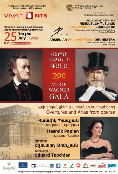 Հայաստանի պետական ֆիլհարմոնիկ նվագախումբը ներկայացնում է այս համերգաշրջանի վերջին համերգը՝ նվիրված կոմպոզիտորներ Վագների և Վերդիի 200-ամյա հոբելյաններին: