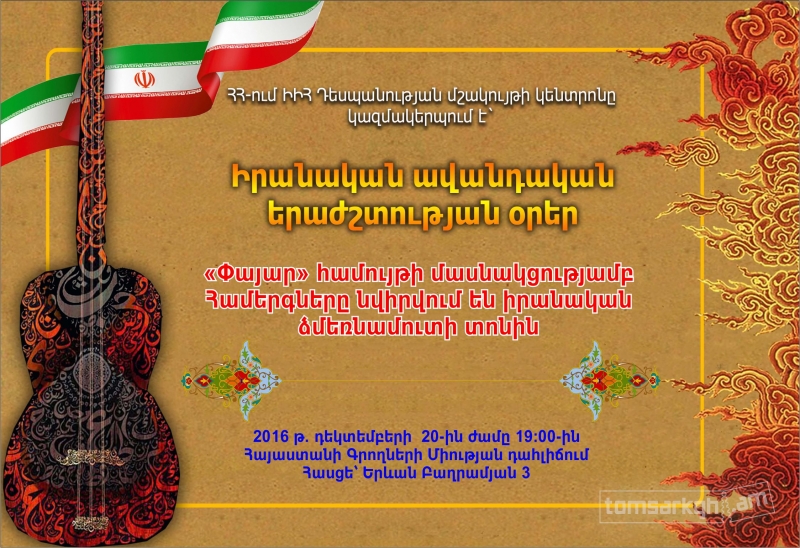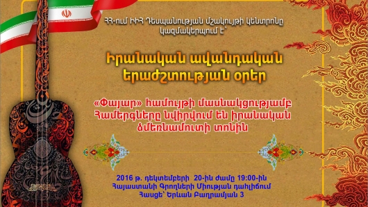 ՀՀ-ում ԻԻՀ դեսպանության մշակույթի կենտրոնը կազմակերպում է՝ Իրանական ավանդական երաժշտության համերգ իրանական ձմեռնամուտի առիթով: