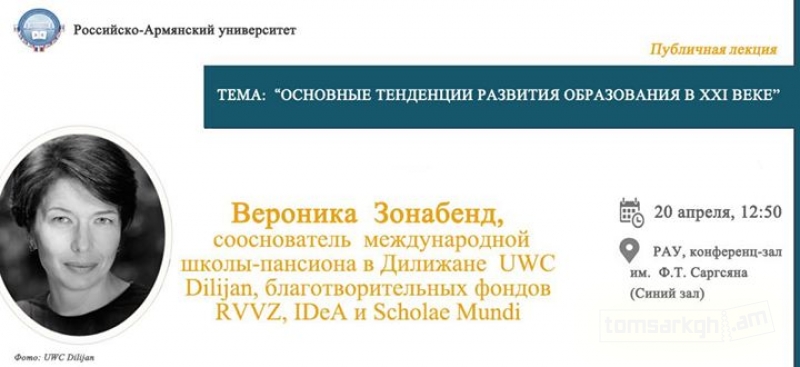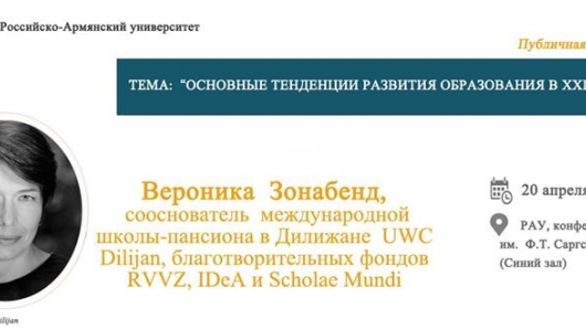 20 апреля в 12:50 в конференц-зале им. Ф.Т. Саргсяна РАУ (Синий зал) состоится публичная лекция Вероники Зонабенд, сооснователя международной школы-пансиона в Дилижане UWC Dilijan, благотворительных фондов RVVZ, IDeA и Scholae Mundi, которые реализуют в России и Армении долгосрочные благотворительные проекты, направленные на устойчивое развитие.