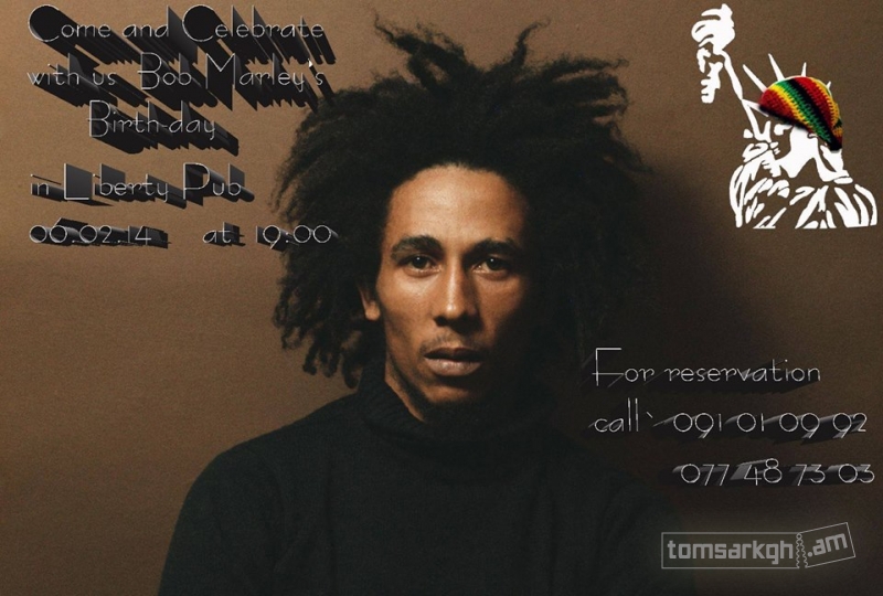 Ռեգգիի սիրահար եք, ուրեմն կցանկանաք անցկացնել Ձեր հինգշաբթի երեկոն Ռեգիի արքայի ծննդյան օրը նշելով: Ողջ երեկոյի ընթացքում կհնչի ռեգգի երաժշտություն, թե Բոբ Մարլիի և թե այլ ռեգգի երաժիշտների կատարմամբ և կտիրի երաժշտությանը համապատասխան տրամադրություն: Այս ամենի մասնակից լինելու համար Ձեզնից կպահնաջվի միայն նախապես սեղան ամրագրել Liberty pub-ում: