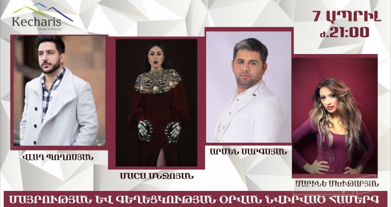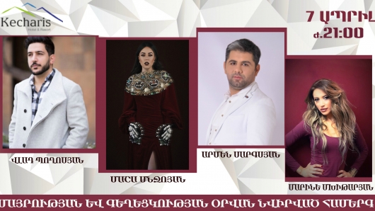 Անցկացրեք Մայրության և Գեղեցկության Տոնին նվիրված ջերմ երեկոն Կեչառիս հյուրանոցում՝ վայելելով սիրված երգիչների մասնակցությունը,ճաշակելով մեր խոհարարների կողմից պատրաստված համեղ ուտեստները, և համտեսելով գինիների լայն տեսականին: