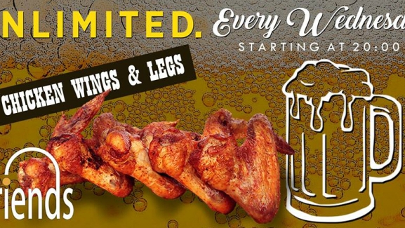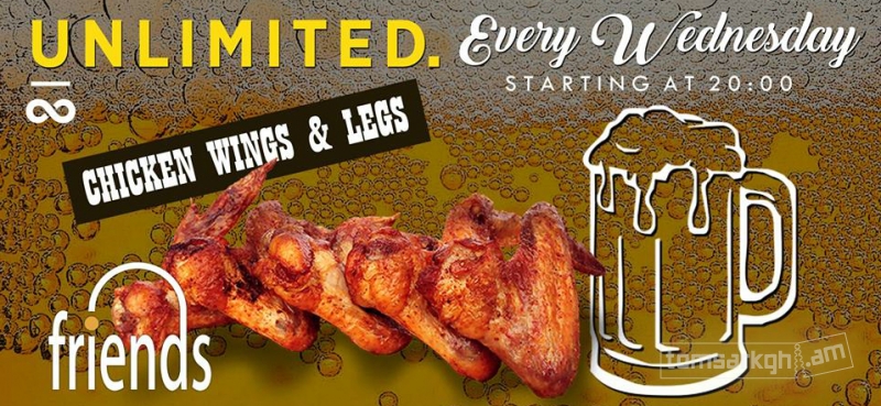 Ամեն չորեքշաբթի, ինչպես միշտ, Friends Pub-ը հրավիրում է վայելելու ամենահամեղ և ախորժելի, խրթխրթան հավի թևիկներն ու բդիկները, այն էլ անսահմանափակ քանակությամբ, ընդամենը 2500 դրամով: