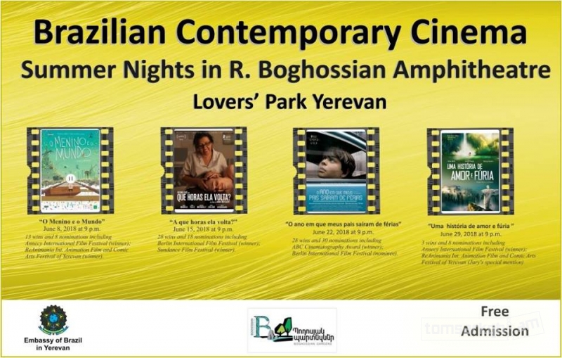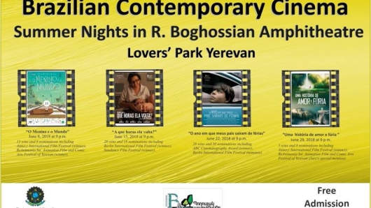 The Embassy of Brazil in Yerevan is thrilled to announce this year's open-air cinema screenings in R. Boghossian Amphitheatre Lovers' Park Yerevan throughout June, 2018. Screening a different film (with English subtitles) each night. Winners and nominees of famous international film festivals of recent years are included in the program.