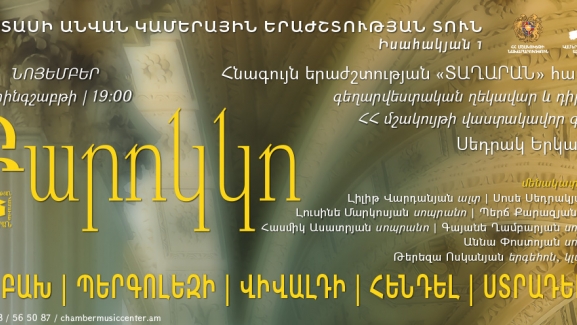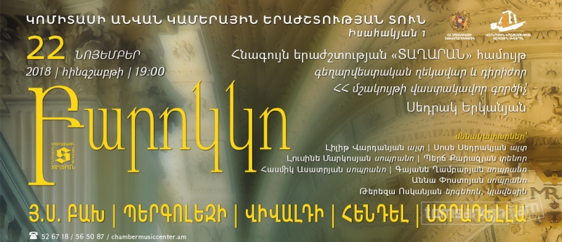 Նոյեմբերի 22-ին, ժ. 19:00 Կոմիտասի անվան կամերային երաժշտության տանը «Բարոկկո» խորագրով տեղի կունենա Հնագույն երաժշտության «Տաղարան» համույթի (գեղարվեստական ղեկավար և դիրիժոր` ՀՀ մշակույթի վաստակավոր գործիչ Սեդրակ Երկանյան) համերգը: