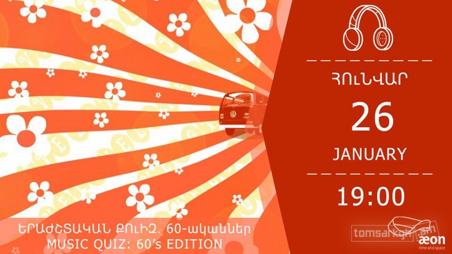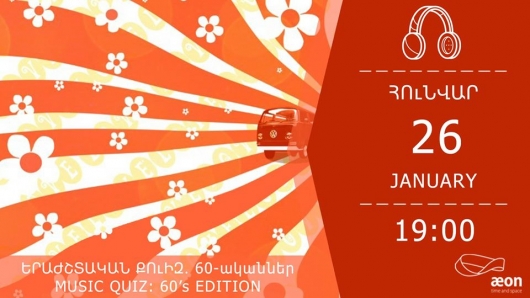 Հունվարի 26-ին, ժամը 19։00-ին մենք խաղալու ենք այս տարվա առաջին երաժշտական քուիզը, որն այս անգամ նվիրված է գունավոր և ռոքնռոլաշատ 60-ականներին։
