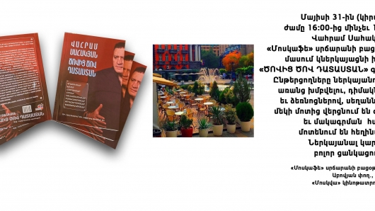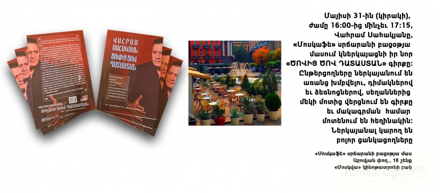Մայիսի 31-ին (կիրակի), ժամը 16։00-ից մինչեւ 17։15, Վահրամ Սահակյանը «Մոսկաֆե» սրճարանի բացօթյա մասում կներկայացնի իր նոր