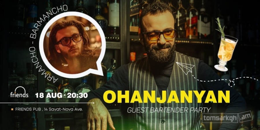 Ֆռենդսի guest bartender Արսեն Օհանջանյանն ու մեր Armancho-Barmancho-ն միասին պայթեցնելու են ալկոդարանը։ Դե ուրեմն սկսի՛ր պատրաստել խմելու շորերը, տրամադրվել, հրավիրել ընկերներին՝ թօօօյն bartender-party ա սպասվում ու մեծ լվացք