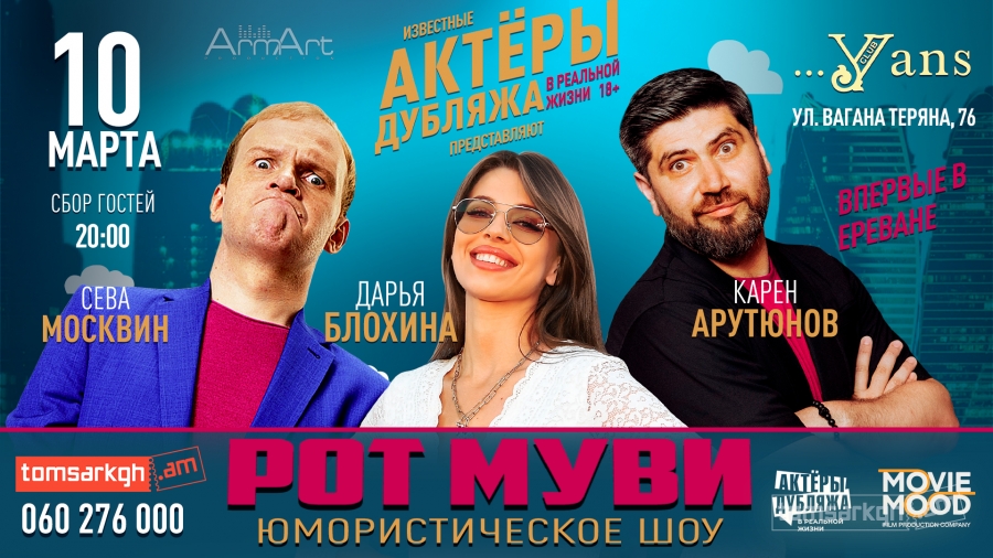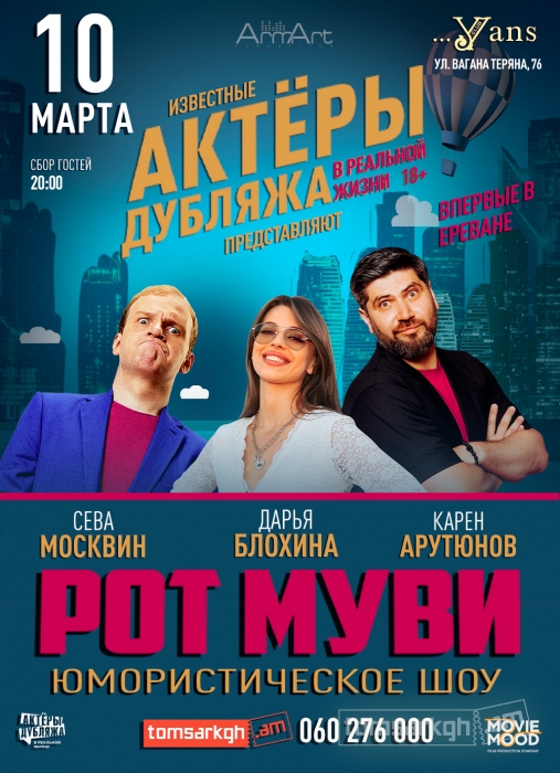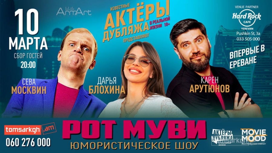 На сцене “HARD ROCK CAFE YEREVAN”-“РОТ МУВИ" - комедийное шоу с актерами дубляжа. Карен Арутюнов и Дарья Блохина разыгрывают импровизированные киносюжеты своими фирменными голосами. А веселый пианист Сева Москвин подыгрывает ребятам и создает музыкальную атмосферу.