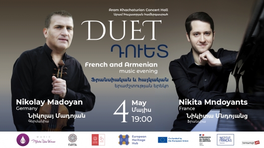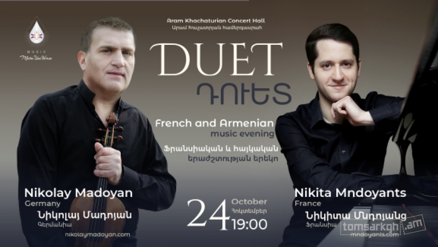 Մայիսի 4-ին «Արամ Խաչատրյան» համերգասրահում անվանի երաժիշտներ ջութակահար Նիկոլայ Մադոյանը և դաշնակահար Նիկիտա Մնդոյանցը կներկայացնեն ֆրանսիական և հայկական երաժշտություն։