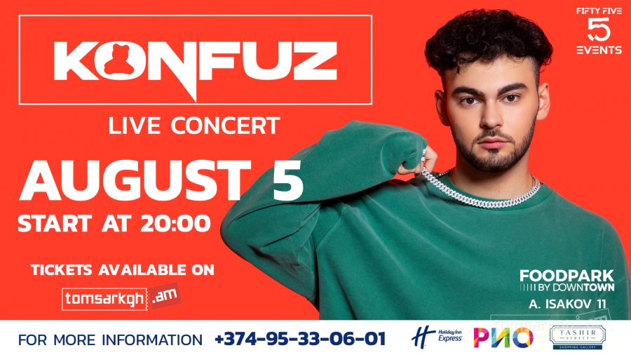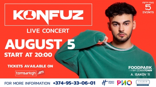 KONFUZ-ի բացառիկ համերգը FoodPark by DownTown-ի բացօթյա տանիքում: Օգոստոսի 5–ին , 20:00–ին հանդիպում ենք FoodPark by DownTown–ի տանիքում, լսելու և վայելելու KONFUZ-ի հիթային կատարումները, ինչպիսինն են ՝ Кайф ты поймала, Ратата, Война, Ранила меня և այլն: Շտապիր ձեռք բերել քո տոմսը: