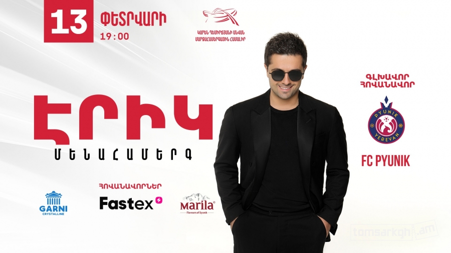 Փետրվարի 13-ին Կ. Դեմիրճյանի անվ. ՄՀՀ-ի մեծ դահլիճում տեղի կունենա երգիչ Էրիկ Կարապետյան երկար սպասված մեծ մենահամերգը։ Համերգային ծրագրում ընդգրկվել են երգչի արդեն սիրված, ինչպես նաև բոլորովին նոր ստեղծագործությունները, որոնք հանդիսատեսին կներկայացվեն կենդանի նվագախմբի նվագակցությամբ, լուսային և բեմական աննախադեպ լուծումներով։ Շոուն կտրուկ տարբերվելու է, ինչպես ձայնային հնչողության եւ երաժշտական նոր մոտեցմամբ, այնպես էլ` վիզուալ նոր կոնցեպտով, բեմական ժամանակակից հագեցվածությամբ։