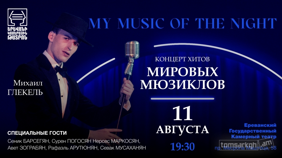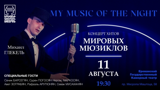 Михаил Глекель - международный солист мюзиклов из Санкт-Петербурга в свой день рождения проведёт первый сольный концерт в Армении! В концерте «My music of the night» прозвучат хиты величайших мировых мюзиклов: Нотр-Дам де Пари, Призрак оперы, Король Лев, Вестсайдская история и др. Специальные гости - звёзды ереванской постановки мюзикла «Сансет Бульвар».