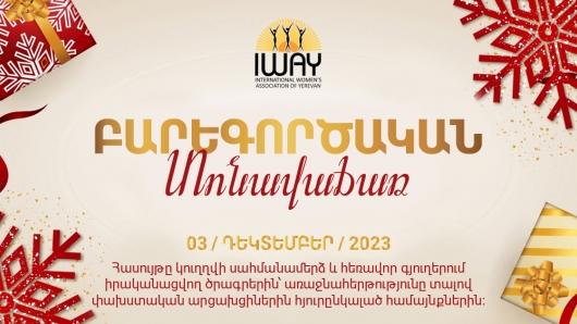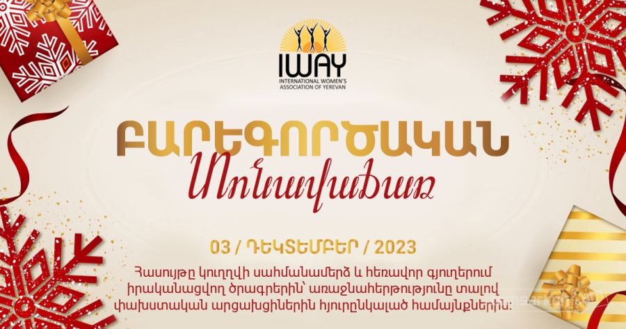 Դեկտեմբերի 3-ին Հոլիդեյ Ինն Երևան՝ Հանրապետության Հրապարակ հյուրանոցում տեղի կունենա Երևանում Կանանց Միջազգային Միավորման՝ IWAY-ի կողմից անցկացվող ամենամյա Բարեգործական Տոնավաճառը, որից ստացված ողջ հասույթը կուղղվի սահմանամերձ և հեռավոր գյուղերում իրականացվող ծրագրերին՝ առաջնահերթությունը տալով փախստական արցախցիներին հյուրընկալած համայնքներին։ Միջոցառումը ներառելու է լավ տրամադրություն, երաժշտական հագեցած ծրագիր, ավելի քան 100 նվերների խաղարկություն, արժեքավոր նկարի աճուրդ, համեղ հյուրասիրություններ, երեխաների համար հետաքրքիր ժամանց և գունագեղ անակնկալներ։