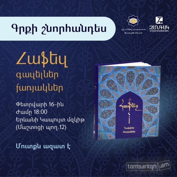 Փետրվարի 16-ին, ժամը 18։00-ին, Երևանի Կապույտ մզկիթի նիստերի դահլիճում կկայանա «Հաֆեզ․ գազելներ, քառյակներ» գրքի շնորհանդեսը։