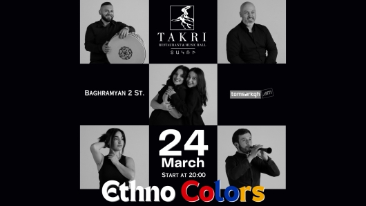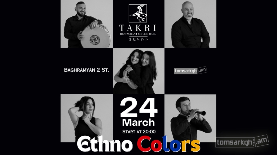 Մարտի 24-ին, հրավիրում ենք Ձեզ անչափ հետաքրքիր և ինքնատիպ “Ethno Colors” խմբի (sixtet կազմով) համերգային երեկոյին, որի ընթացքում կհնչեն ճանաչված և սիրված երևանյան ֆոլկ երգեր, ինչպես նաև սիրված հայկական էթնո երգեր և երաժշտություն: Այնպես որ, բարձր տրամադրությունն ու ուրախ ժամանցն անխուսափելի է: