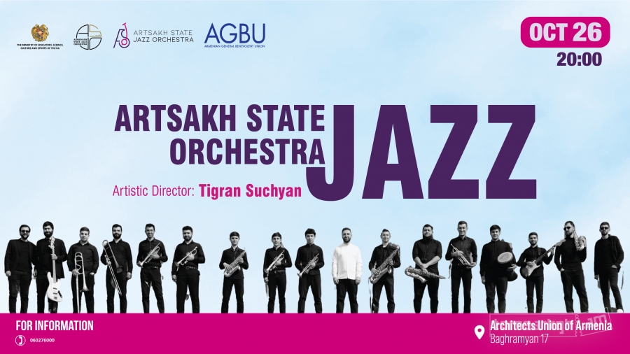 Join us for an exclusive concert on October 26, featuring the Artsakh State Jazz Orchestra. The concert will take place at the Architects' Union Hall.