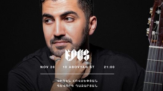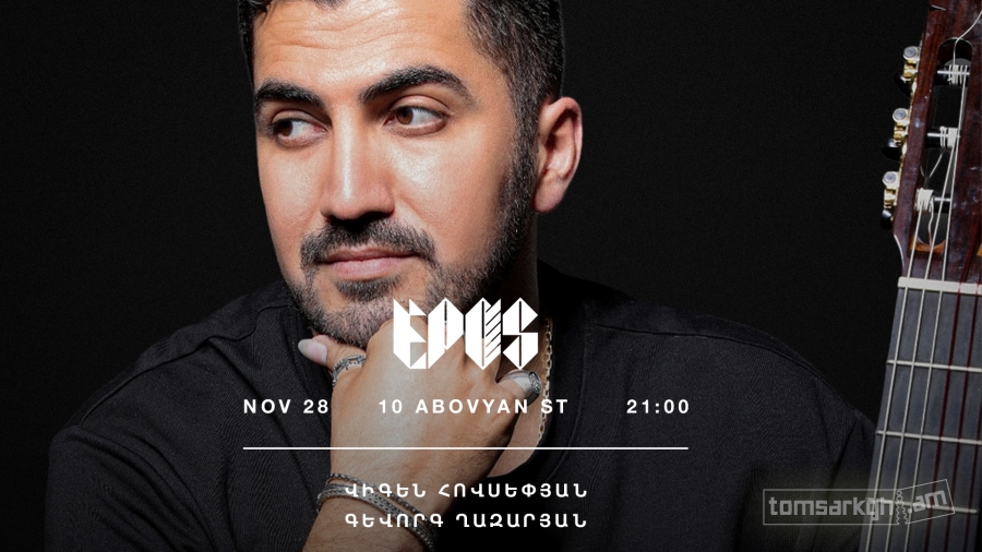 Նոյեմբերի 28 | 21:00 Վիգեն Հովսեփյան և Գևորգ Ղազարյան Մթնոլորտ լցված երաժշտության կախարդանքով, սիրո երանգներով Աբովյան 10 | Էպոս ակումբ Մուտքավճար՝ Բեմի հատված 8000 դրամ Ոչ այդքան տեսանելի հատված՝ 7000 դրամ Կազմակերպիչ՝ Ինդիկում ՍՊԸ