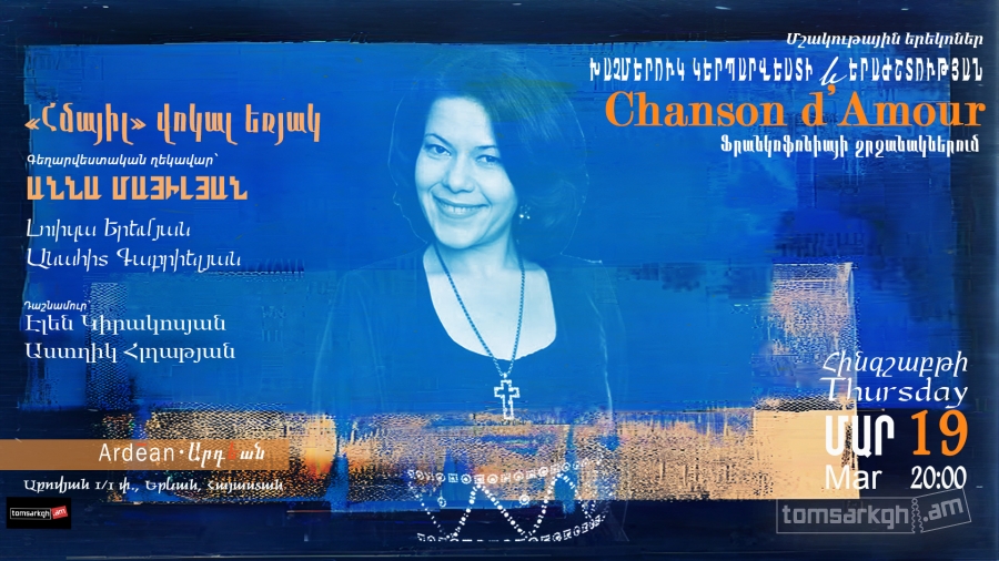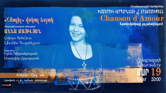 Մարտի 19-ին, ժամը 20։00-ին «Արդեան»-ը (հասցե՝ Աբովյան 1/1) Հայաստանում Ֆրանկոֆոնիայի օրերի շրջանակում կհյուրընկալի «Chansons d’amour» խորագիրը կրող երաժշտական երեկոն՝ մասնակցությամբ «Հմայիլ» վոկալ եռյակի՝ գեղարվեստական ղեկավար՝ ՀՀ վաստակավոր արտիստ, ԵԿՊԿ պրոֆեսոր, սոպրանո Աննա Մայիլյանի և անդամներ Լուիզա Երեմյանի ու Անահիտ Գաբրիելյանի: