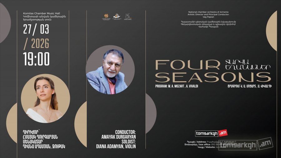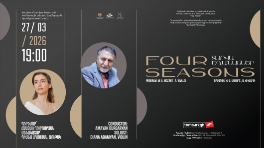 The National Chamber Orchestra of Armenia invites you on March 27 at 19:00 to the Komitas Chamber Music Hall to enjoy together one of the masterpieces of world music — Antonio Vivaldi’s “The Four Seasons.” The soloist of the evening will be Diana Adamyan, winner of the Yehudi