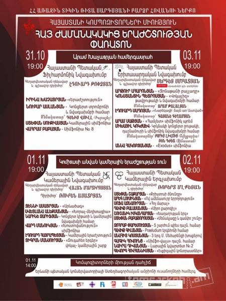 Հայաստանի Կոմպոզիտորների Միությունը հոկտեմբերի 31-ից նոյեմբերի 3-ը ներկայացնում է Հայ ժամանակակից երաժշտության փառատոնը, որի շրջանակներում կհնչեն ժամանակակից հայ կոմպոզիտորների սիմֆոնիկ և կամերային ստեղծագործություններից: