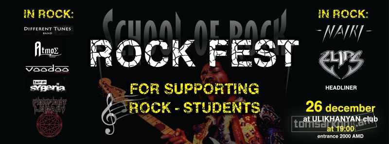 Մեծ սիրով հրավիրում ենք բոլորիդ դեկտեմբերի 26- ին Ուլիխանյան ակումբում կայանալիք Ռոք ֆեստին, որը նվիրվում է Երևանի ռոք դպրոցի բոլոր ուսանող- երեխաներին: Համերգի ողջ հասույթը ուղղվելու է երեխաներին երաժշտական տեխնիկա գնելուն: