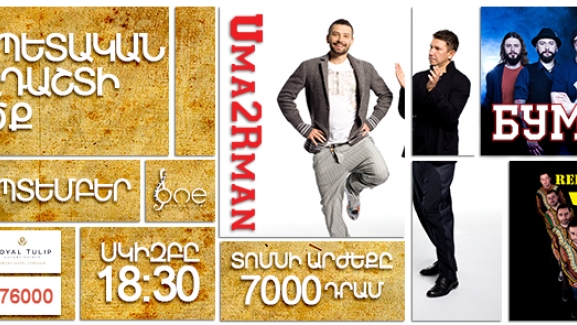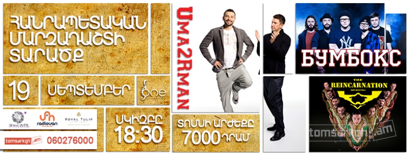 Սեպտեմբերի 19-ին՝ ժամը 18:30-ին Հանրապետական մարզադաշի հարակից տարածքում վայելիր քո սիրելի հիթերը Ռեինկարնացիայի, Բումբոքսի և Ումատուրմանի կատարմամբ՝ բացօթյա համերգի ընթացքում:
