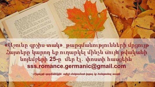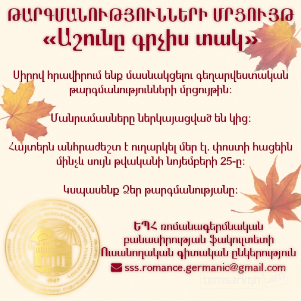ԵՊՀ ռոմանագերմանական բանասիրության ֆակուլտետի ՈՒԳԸ-ն կազմակերպում է ամենամյա «Աշունը գրչիս տակ» գեղարվեստական թարգմանություններ֊ի մրցույթ֊ը։