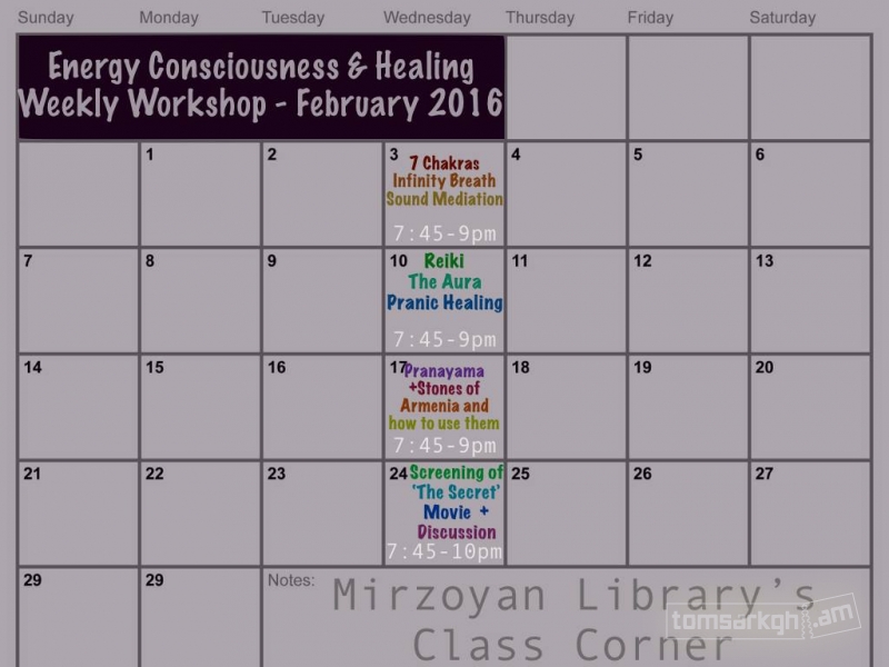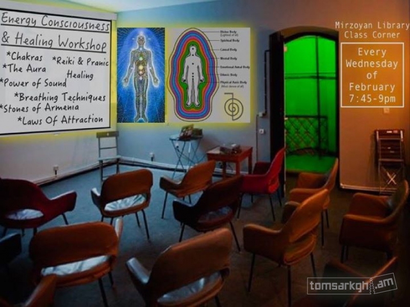 Come into Mirzoyan Library 's Class Corner every Wednesday of February for an extensive workshop on Energy Healing, and Energy Consciousness. You must attend all the courses as they are inter-connected. All together for the month it will be 8,000AMD to be paid on the first day. Please email confirmation of attendance to : azat.anicarla@gmail.com