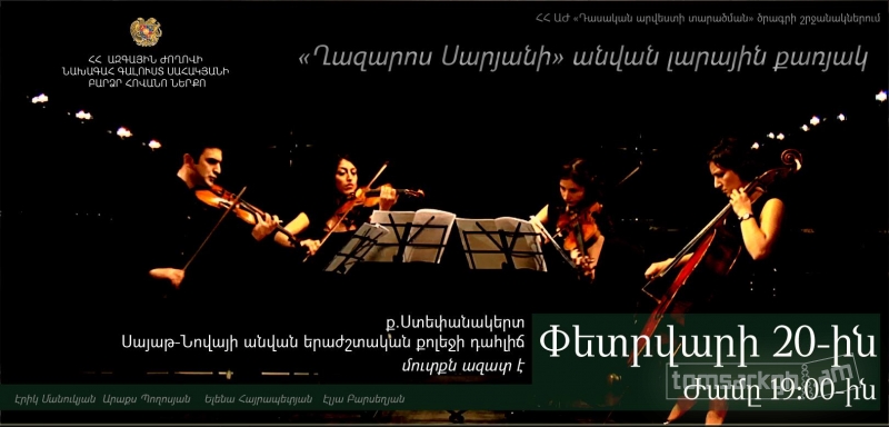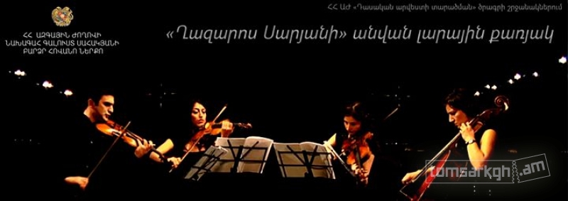 Փետրվարի 20-ին ՀՀ ԱԺ «Դասական արվեստի տարածման» ծրագրի շրջանակներում Ստեփանակերտի Սայաթ-Նովայի անվան երաժշտական քոլեջի դահլիճում տեղի կունենա «Ղազարոս Սարյանի» անվան լարային քառյակի համերգը: Համերգն իրականացվում է Հայաստանի Հանրապետության Ազգային Ժողովի նախագահ Գալուստ Սահակյանի բարձր հովանու ներքո: Ծրագրում՝ հայկական և արտասահմանյան կոմպոզիտորների ստեղծագործություններ:
